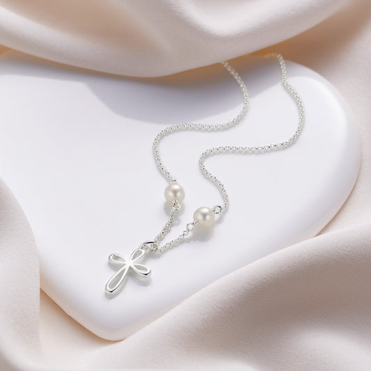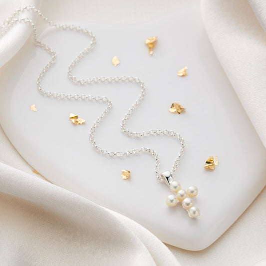 Our cross necklace collection features designs with genuine freshwater pearls. Whether it's a modern pearl and silver rosary necklace or a pearl cross pendant, find beautiful pearl cross necklaces at Molly Brown London.